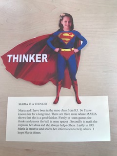 Students nominated their peers for a Learner Profile Superhero award. They then wrote a commendation for that person to go under the superhero.